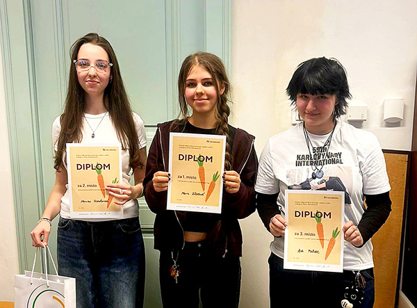 V náročné konkurenci 121 studentů vysokých a středních škol získali naši žáci dvě zlaté, jednu stříbrnou a jednou bronzovou medaili v soutěži odborných cizojazyčných prezentací na Západočeské univerzitě. Soutěžící z naší školy, z oborů cestovní ruch, design interiéru, všeobecné lyceum, multimediální tvorba, zahraniční obchod a grafický design, připravili velmi zajímavé prezentace témat svých oborů a uspěli v jazycích anglickém, německém, ruském, španělském a českém pro cizince. Nejlepších výsledků letos dosáhli v angličtině.