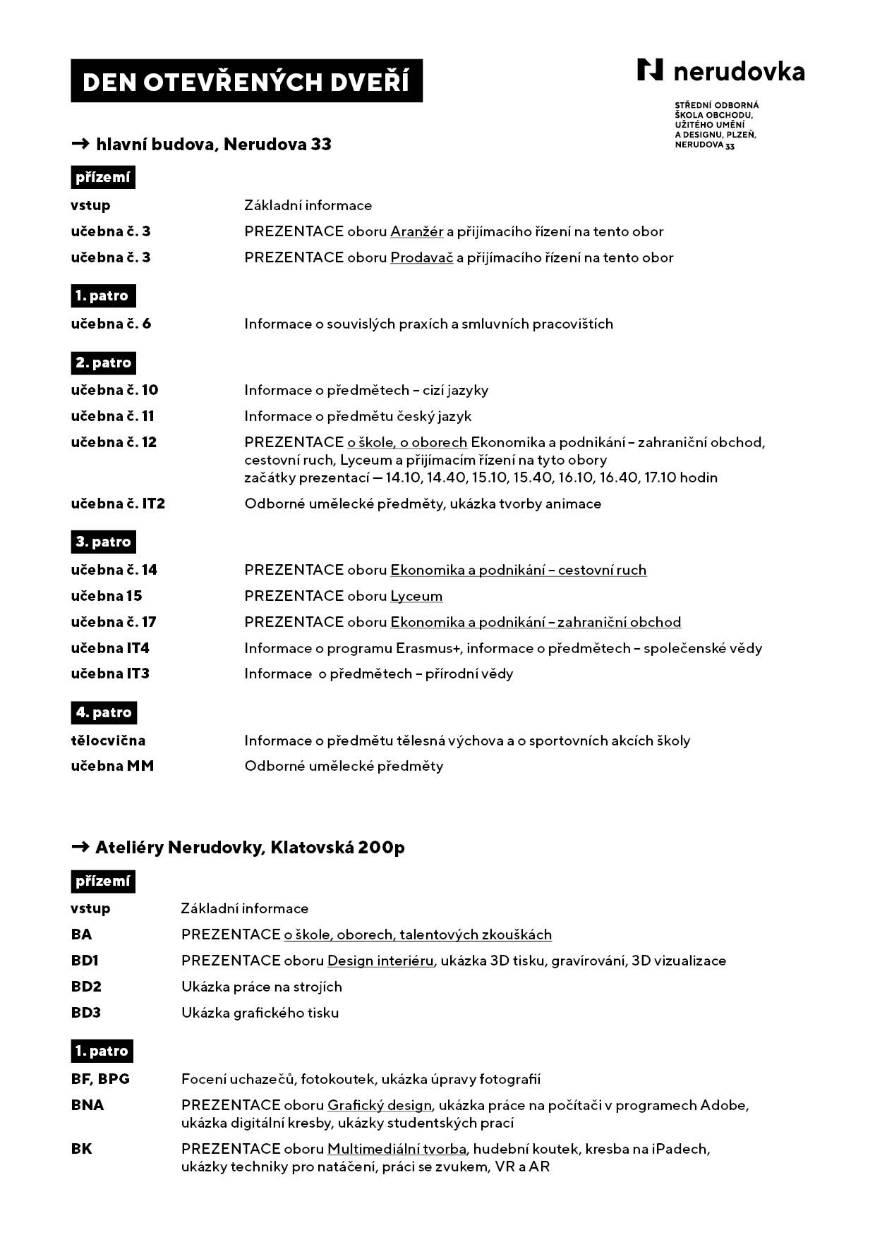 Dny otevřených dveří pořádáme každý rok v listopadu a v lednu vždy od 13.30 do 17.30 hodin. V Ateliérech na Klatovské třídě představujeme umělecké obory. V budově SOŠ v Nerudově ulici pak obor lyceum, ekonomické obory s maturitní zkouškou a obory s výučním listem. Zájemcům poskytujeme komplexní informace o vzdělávání, učebních plánech, profilu absolventa a možnostech uplatnění po maturitě/vyučení. Informujeme také o dalších aktivitách školy, např. zahraničních praxích v rámci programu Erasmus+, exkurzích, souvislých praxích apod. V obou budovách jsou v Den otevřených dveří připraveny k prohlídce odborné i běžné učebny. Pokud si zájemci o umělecké obory přinesou domácí práce, učitelé odborných předmětů je s nimi zkonzultují a případně poradí, jak se připravit k talentovým přijímacím zkouškám. Poskytujeme také informace o přípravných kurzech na umělecké obory i o přípravných kurzech z češtiny a matematiky k přijímacím zkouškám na obory ekonomické a lyceum.