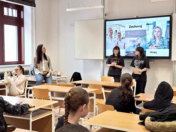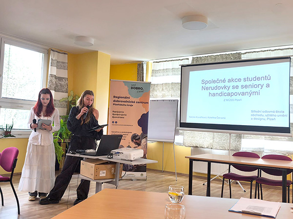 Magdalena Vaicenbacherová z 1. L, Kateřina Červená a Natálie Kováříková ze 3. GD reprezentovaly naši školu na kulatém stole Studenti studentům dne 20. dubna 2026 v Regionálním dobrovolnickém centru – plzeňském Totemu. Představily při něm dobrovolnické projekty a akce naší školy. Děkujeme!