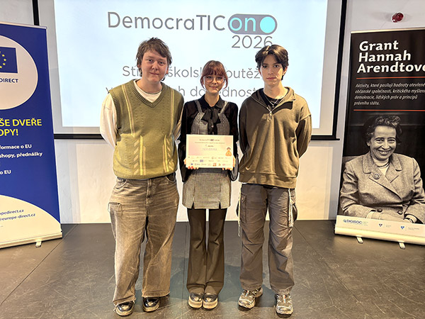Digitální dovednosti (Technology), mediální gramotnost (Information) a kritické myšlení (Critical thinking) jsou znalosti a dovednosti zcela zásadní pro dnešní svět a pro zachování demokracie ve společnosti. Zaměřuje se na ně soutěž DemocraTICon, v níž dosáhli naši žáci mimořádného úspěchu. Tým 2. MI ve složení Justýna Střelková, Jiří Petr Trávníček a Václav Válek vybojoval skvělé 1. místo v celostátním kole, a to v silné konkurenci středoškoláků všech krajů České republiky.