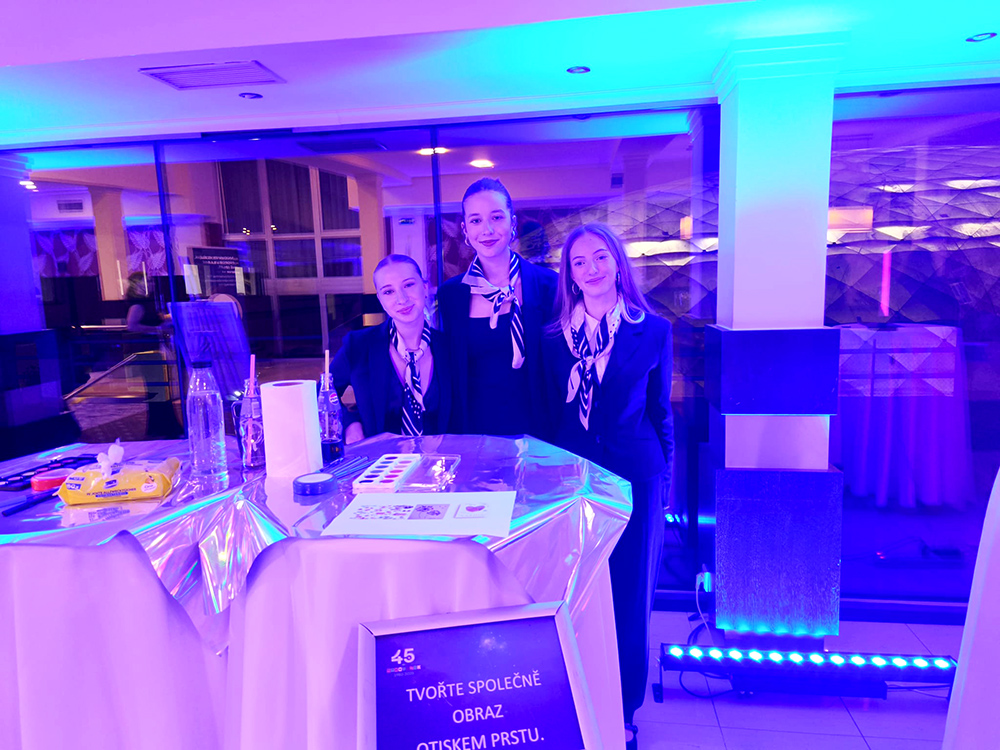 Slavnostní večer přilákal řadu významných hostů a stal se nejen kulturním zážitkem, ale také cennou praktickou zkušeností pro naše studenty oboru cestovní ruch. Ti se zapojili do organizace a zajištění průběhu galavečera na několika úrovních. Podíleli se na správě seznamu hostů a kontrole vstupenek, čímž si vyzkoušeli práci s evidencí účastníků. Pomáhali s navigací hostů ke stolům v sále i na balkóně a starali se o plynulý pohyb návštěvníků v prostoru. Další skupina studentů byla přítomna u vstupu k rautu. Žáci také zajišťovali příjemnou atmosféru při příchodu hostů – rozdávali světelné tyčinky, organizovali tvůrčí aktivitu s barvami na plátno a sbírali vzkazy na strom „Díkovník“.