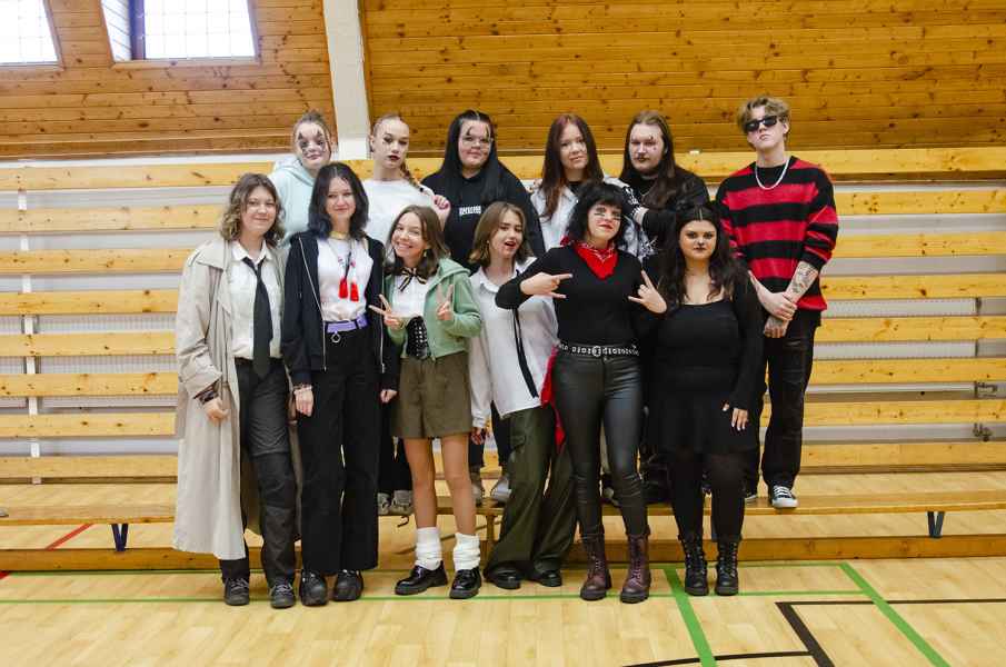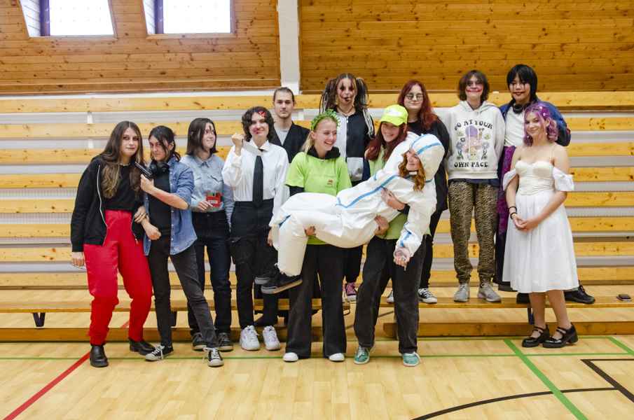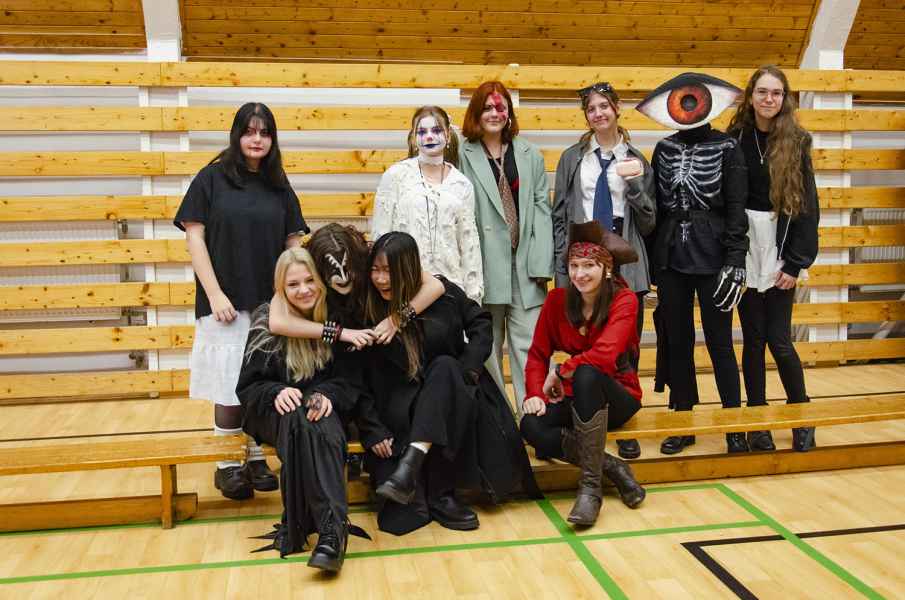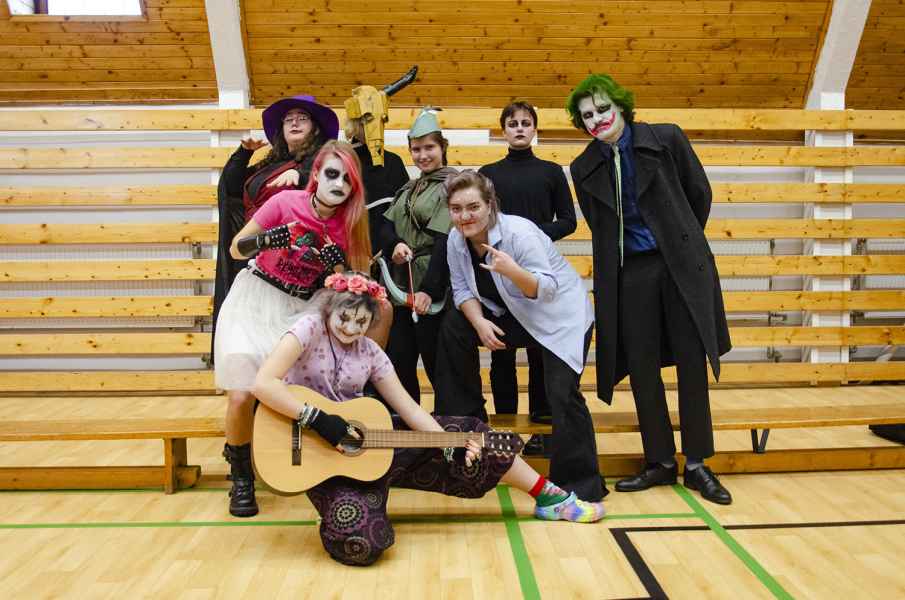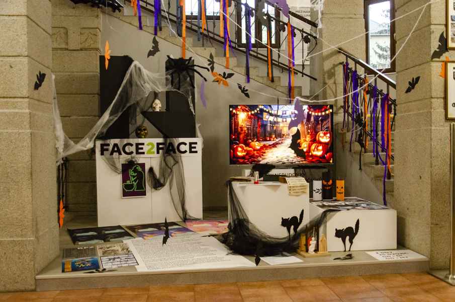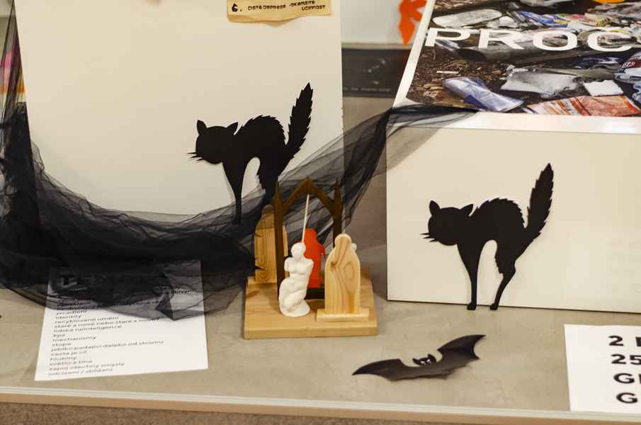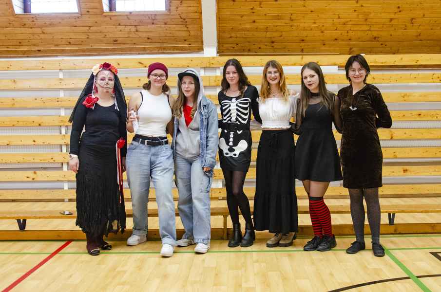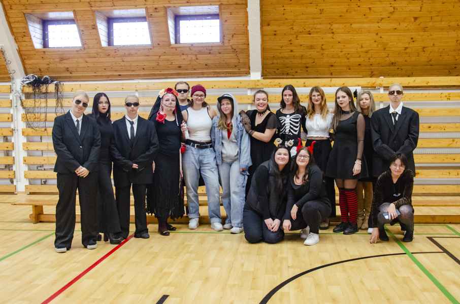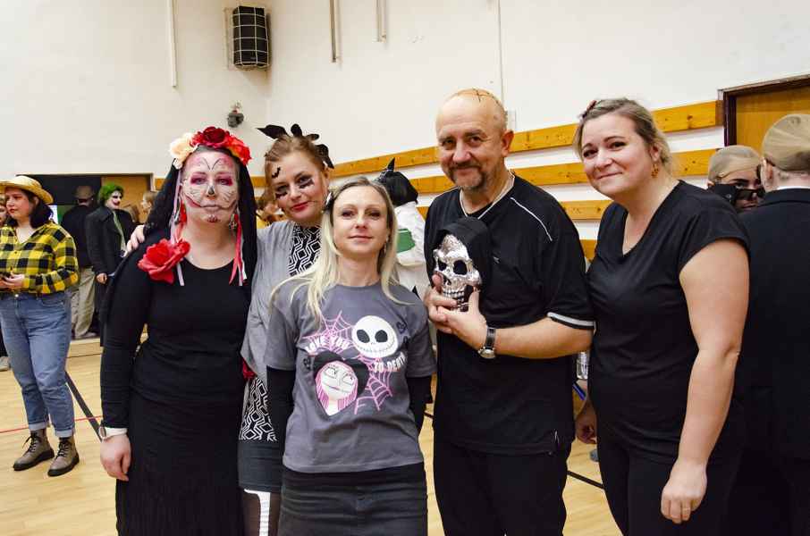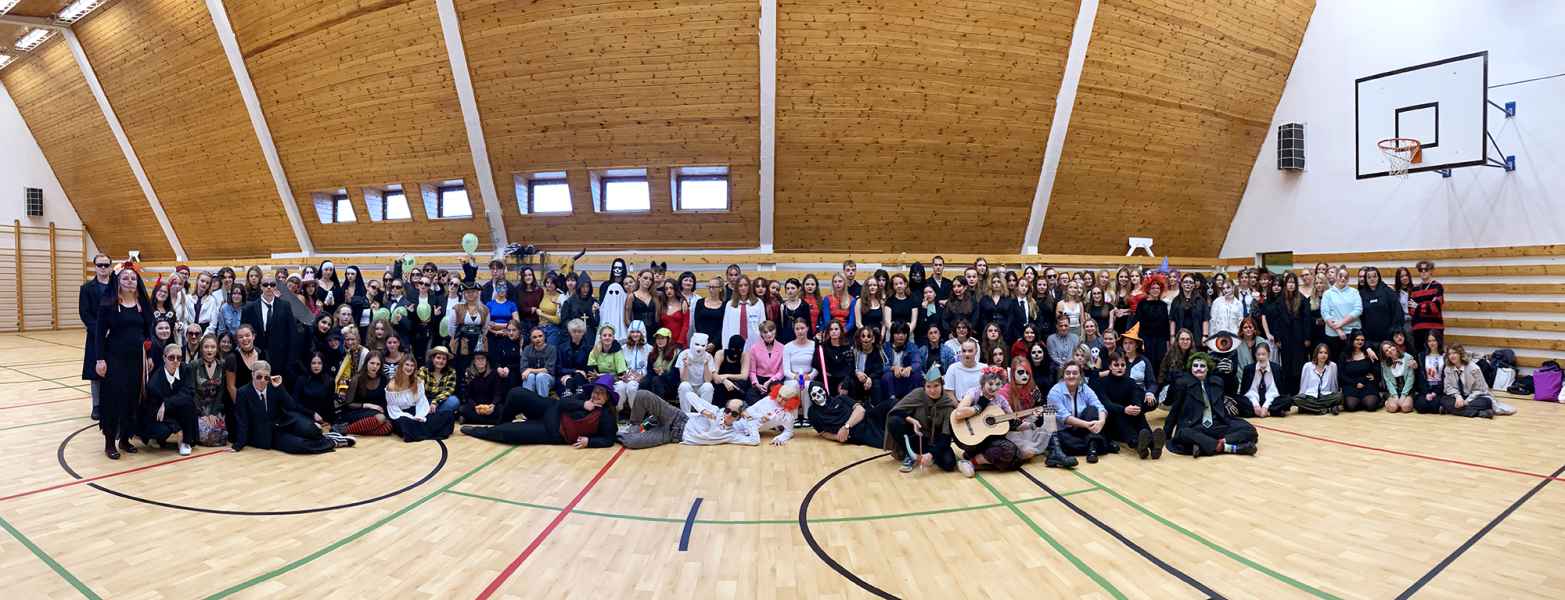 Naše žáky strašení očividně baví, na halloweenském focení se skoro nevešli do tělocvičny. Výzdoba ve foyer se aranžérkám také velmi povedla.